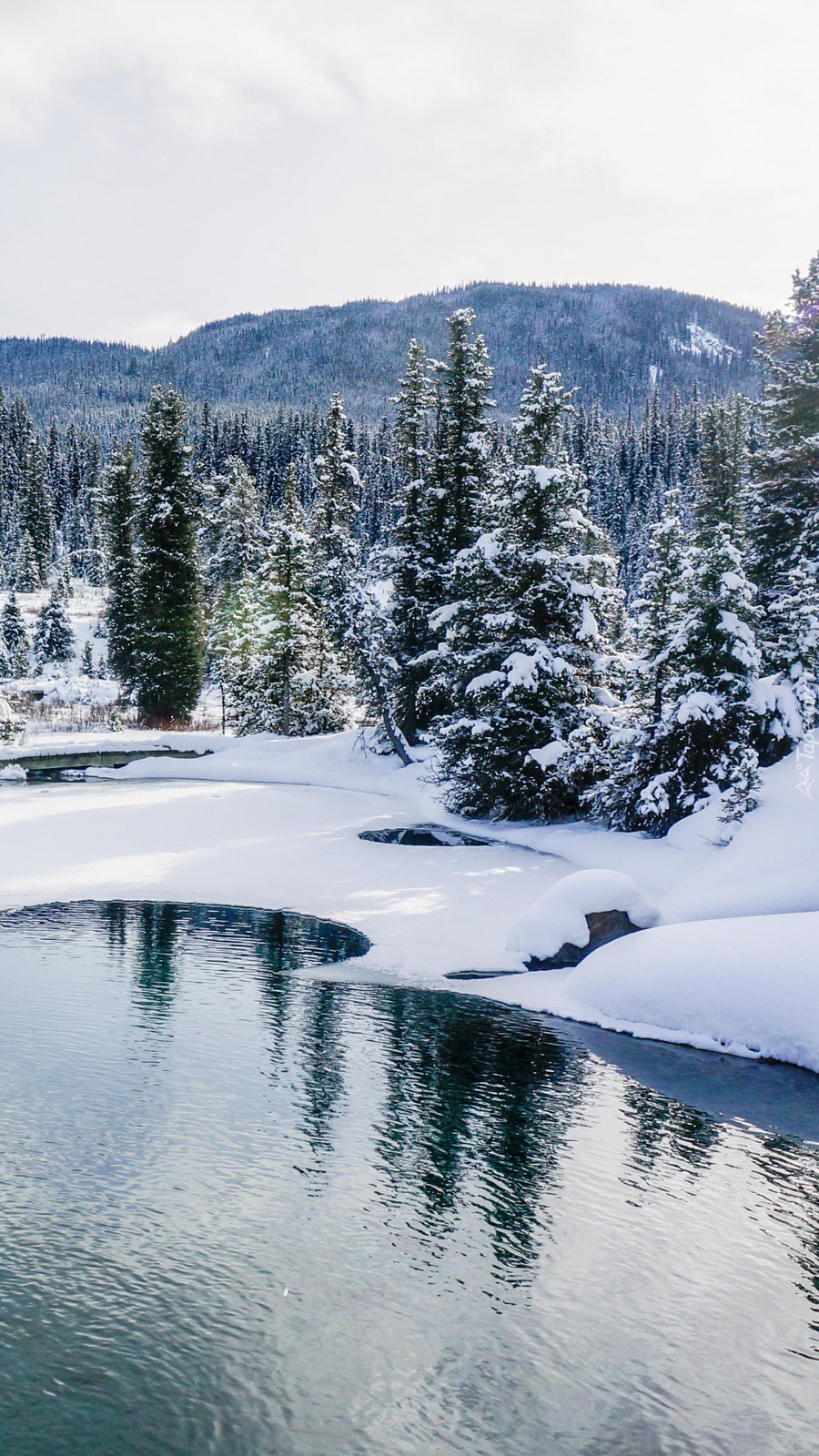 Edytor tapety: Ośnieżone drzewa nad rzeką Johnston Creek