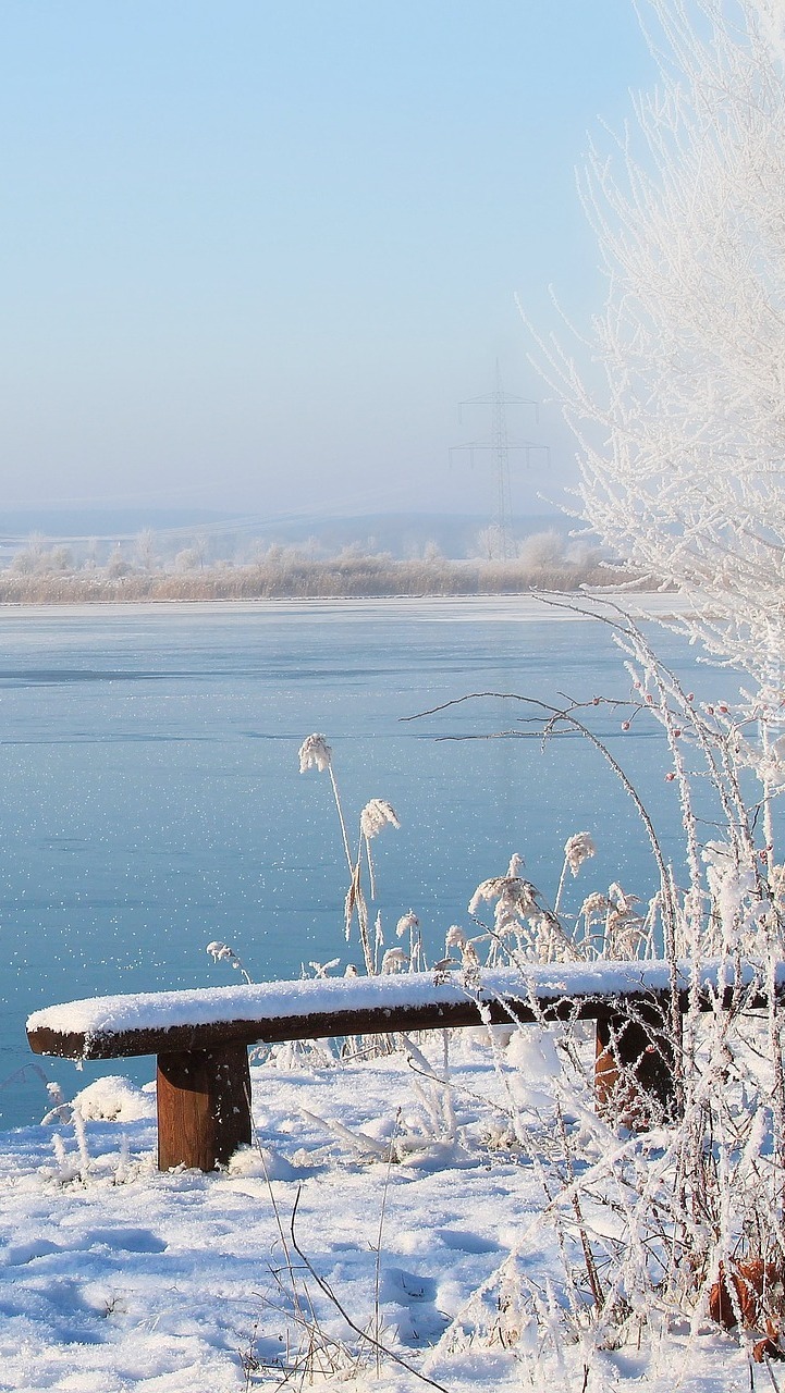 Edytor tapety: Ławka w śniegu nad jeziorem