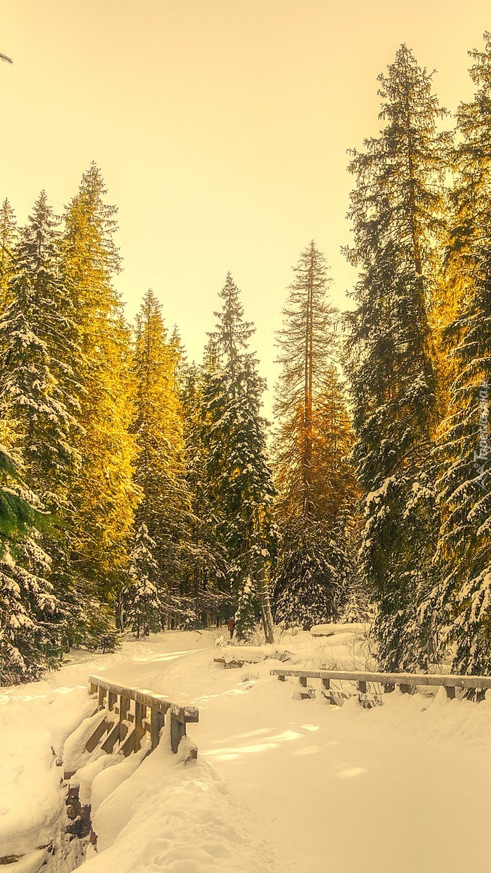 Edytor tapety: Mostek w lesie zasypany śniegiem