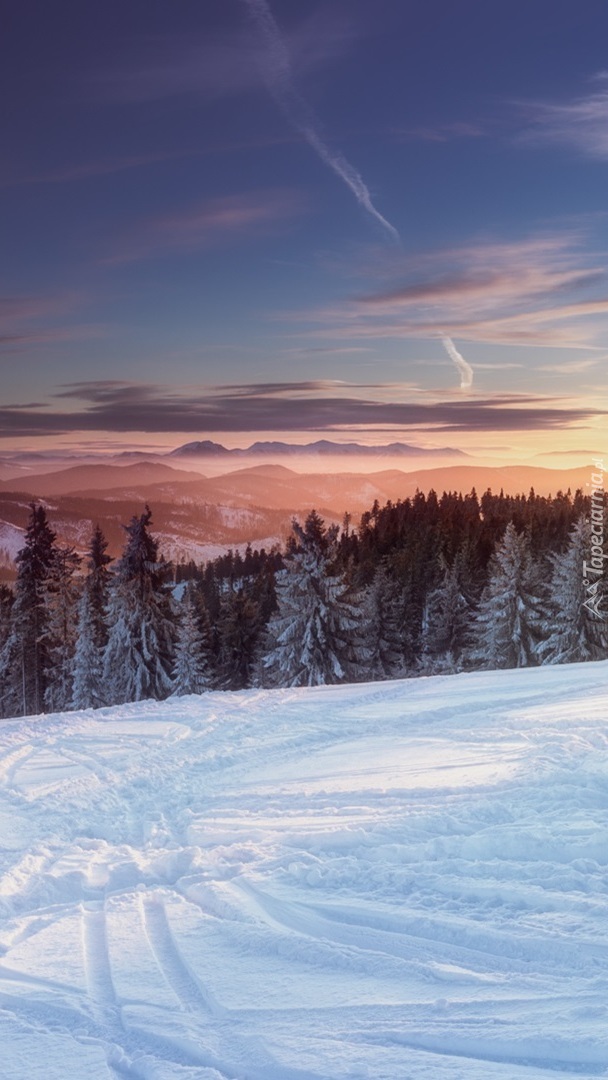 Edytor tapety: Ślady na śniegu pod lasem