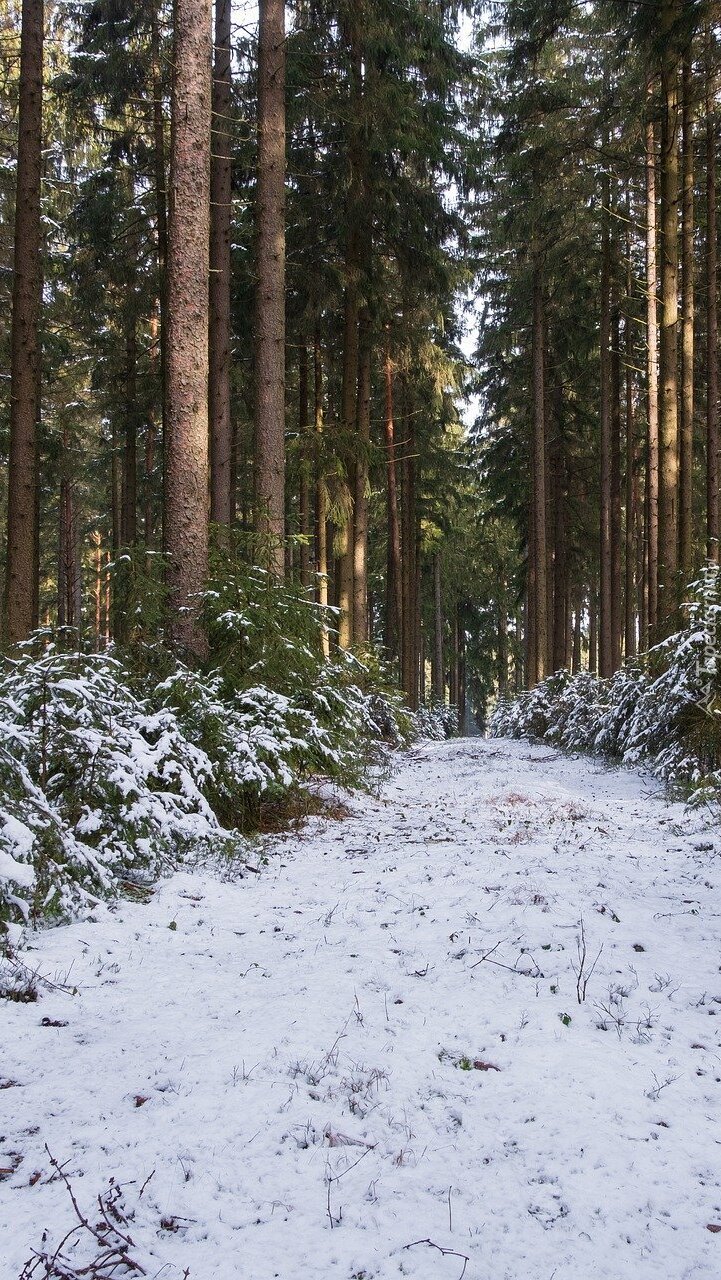 Edytor tapety: Ośnieżona ścieżka i krzewy w lesie