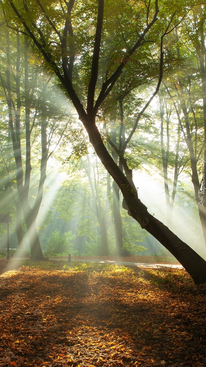 Edytor tapety: Rozświetlone promieniami słońca drzewa w parku
