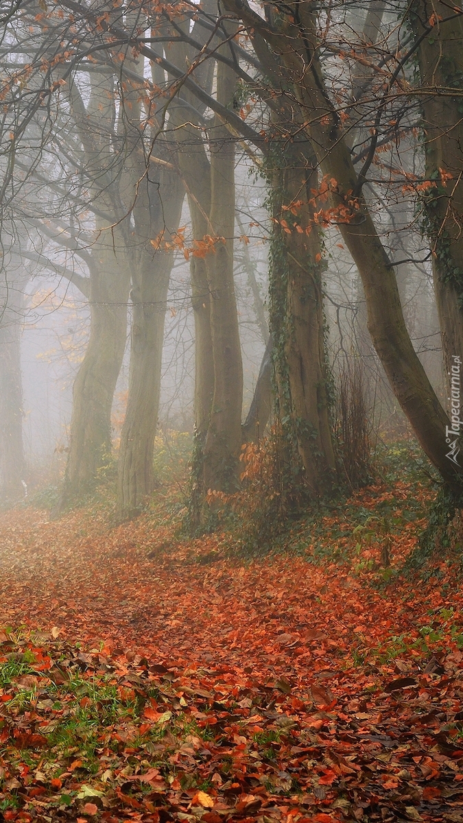 Edytor tapety: Opadłe liście w zamglonym lesie
