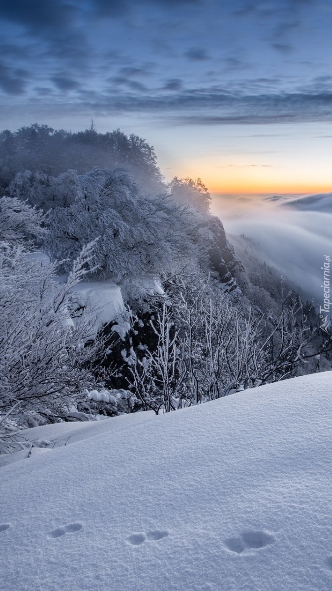 Edytor tapety: Ślady na śniegu obok drzew