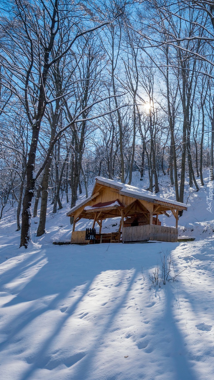 Edytor tapety: Drewniana altana w zimowym lesie