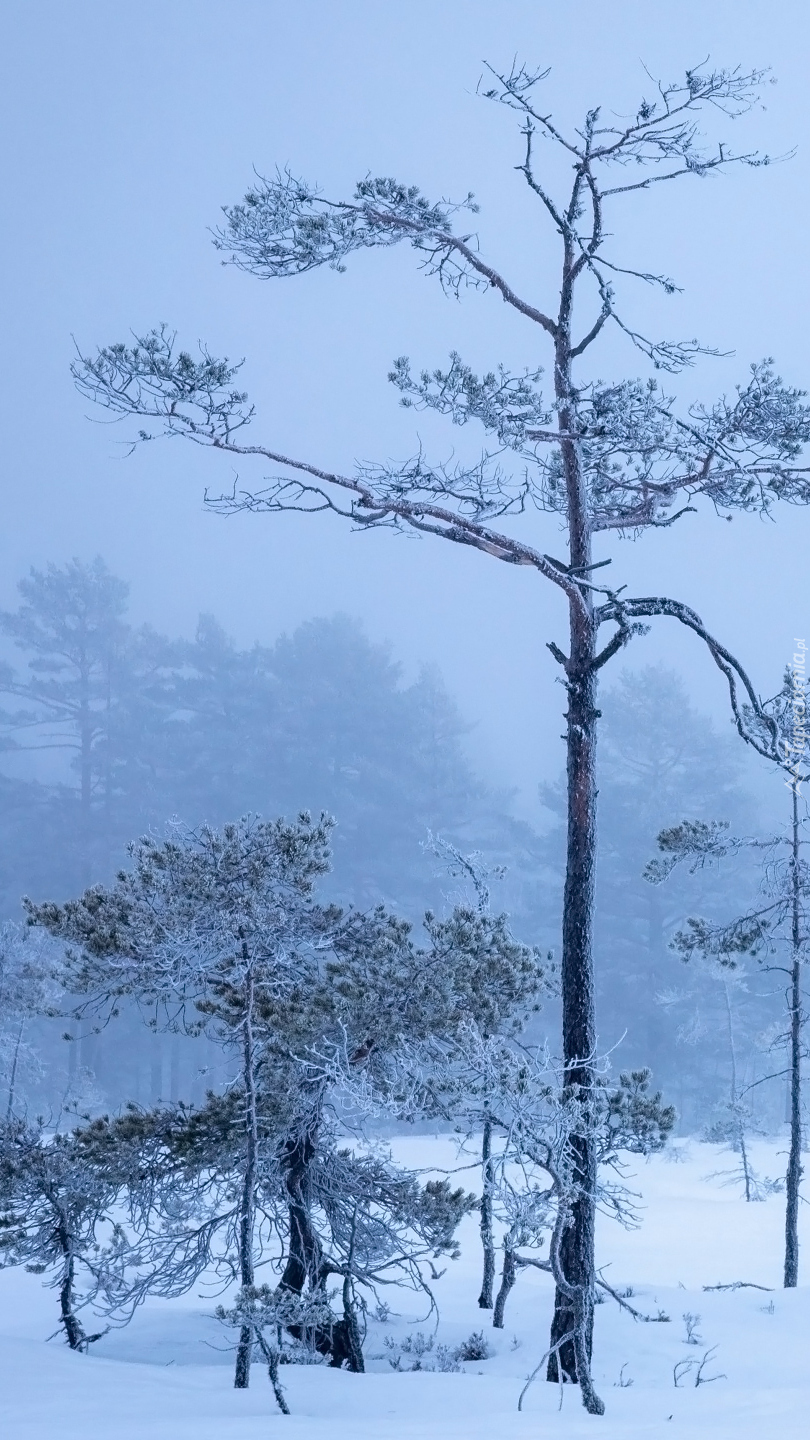 Edytor tapety: Ośnieżone sosny w zamglonym lesie