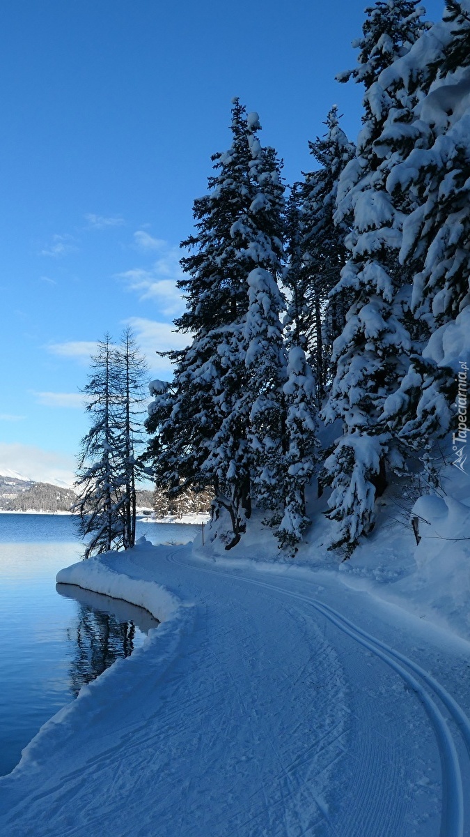 Edytor tapety: Ośnieżone drzewa przy drodze nad jeziorem