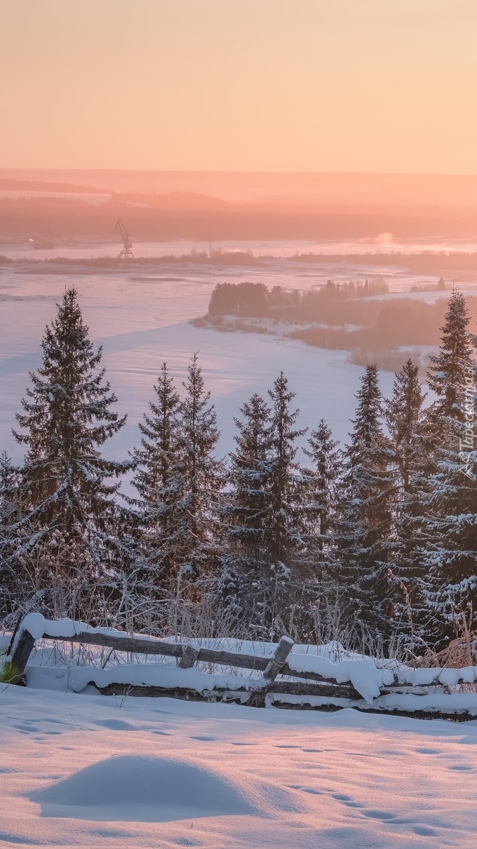 Edytor tapety: Ośnieżone drzewa przy ogrodzeniu