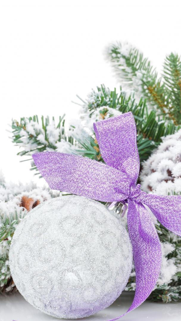 Edytor tapety: Biała bombka z fioletową kokardą