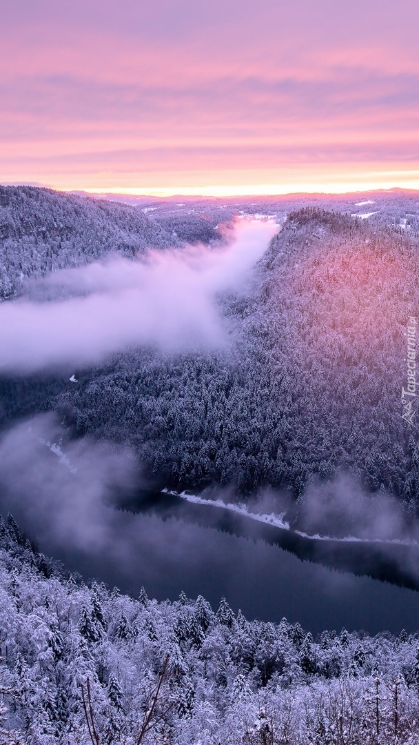 Edytor tapety: Opadająca mgła nad rzeką i lasem