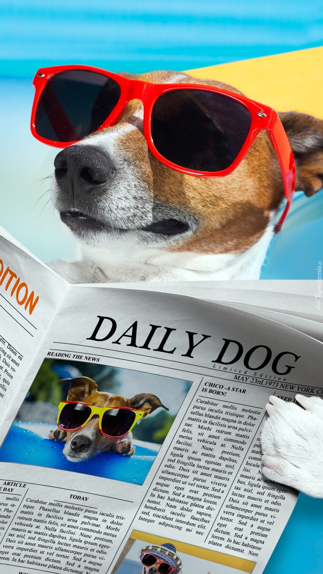 Edytor tapety: Pies czytający gazetę na plaży