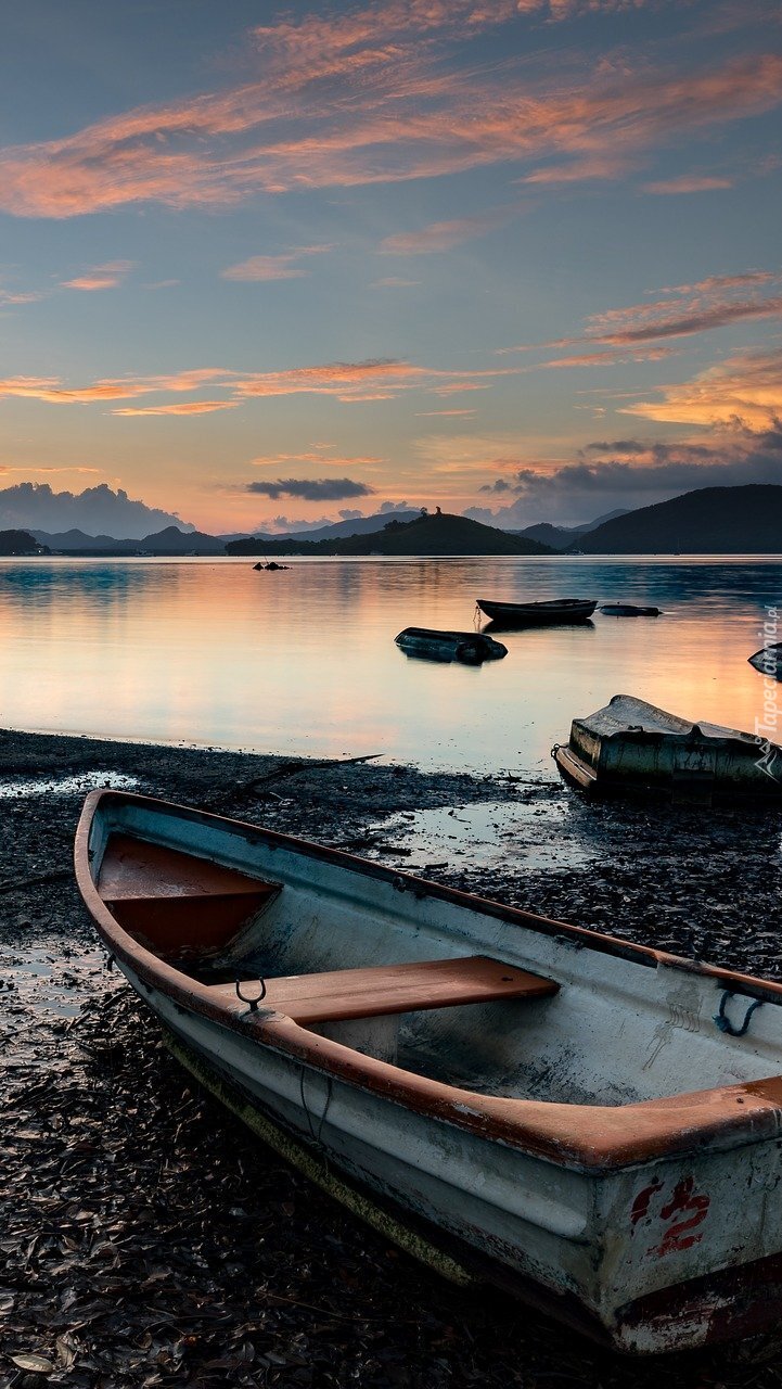 Edytor tapety: Łódki nad brzegiem jeziora