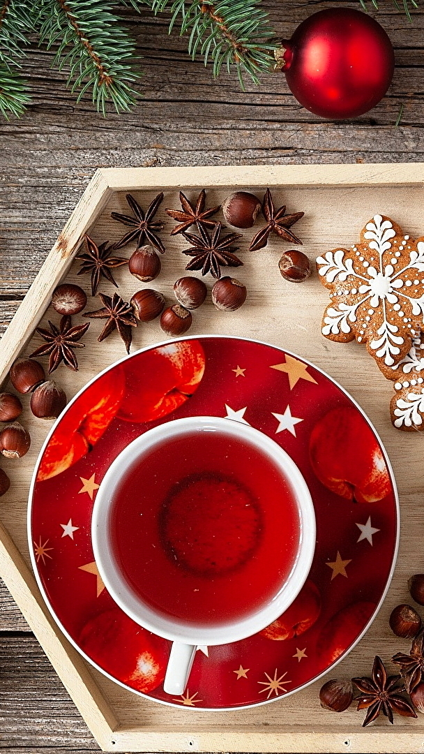 Edytor tapety: Filiżanka herbaty obok gałązek i bombki