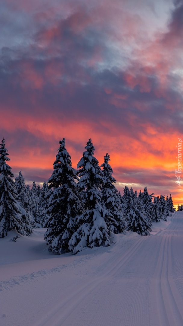 Edytor tapety: Zachód słońca nad ośnieżonymi drzewami