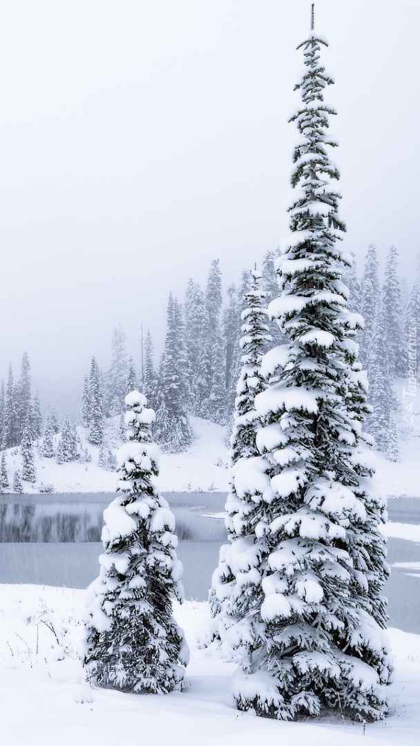 Edytor tapety: Ośnieżone świerki nad jeziorem