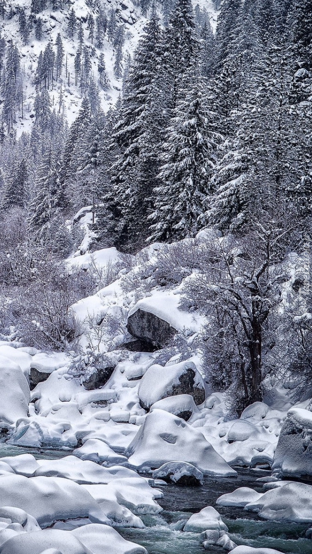 Edytor tapety: Ośnieżone kamienie i drzewa nad rzeką