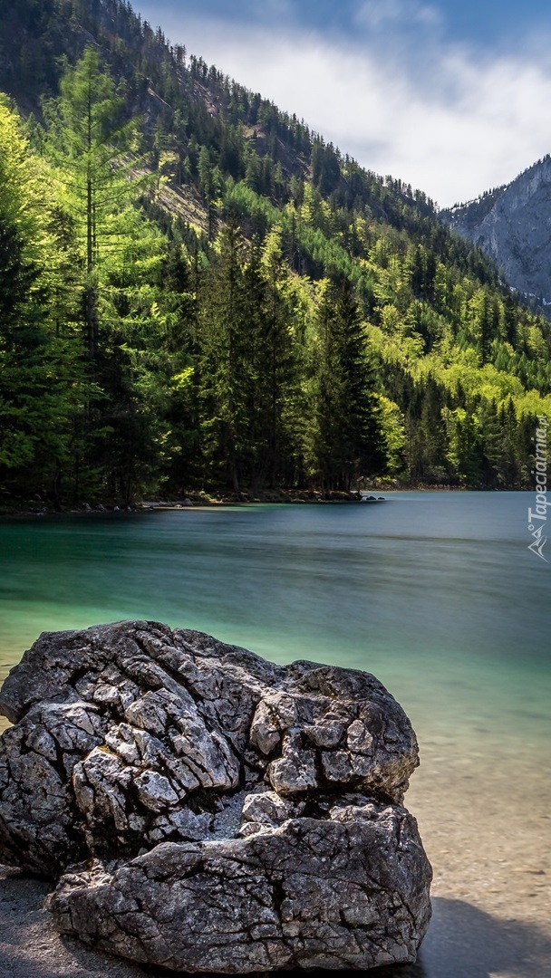 Edytor tapety: Głaz na brzegu górskiego jeziora
