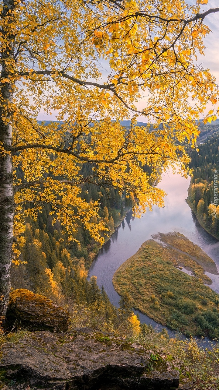 Edytor tapety: Pożółkła brzoza na skałach