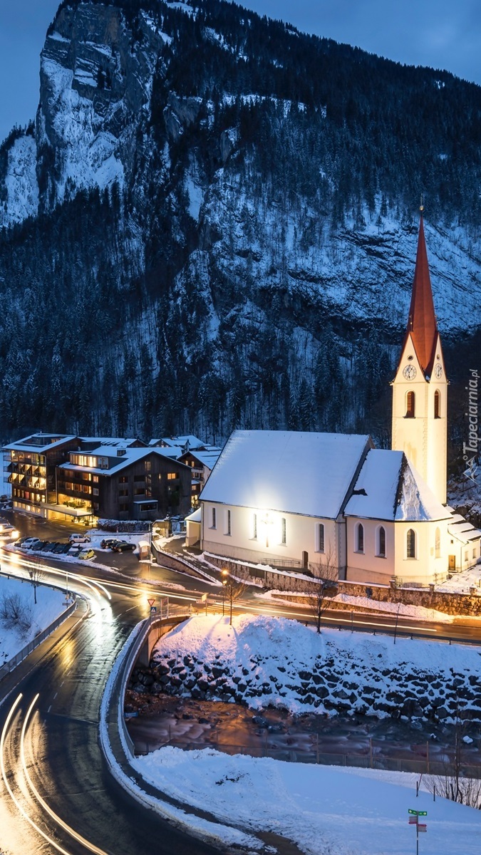 Edytor tapety: Oświetlony kościół w górskim miasteczku