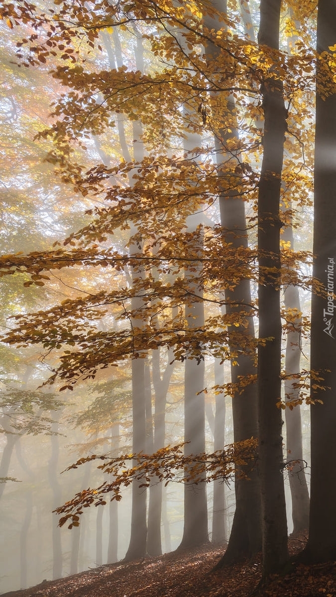 Edytor tapety: Pożółkłe drzewa w zamglonym lesie