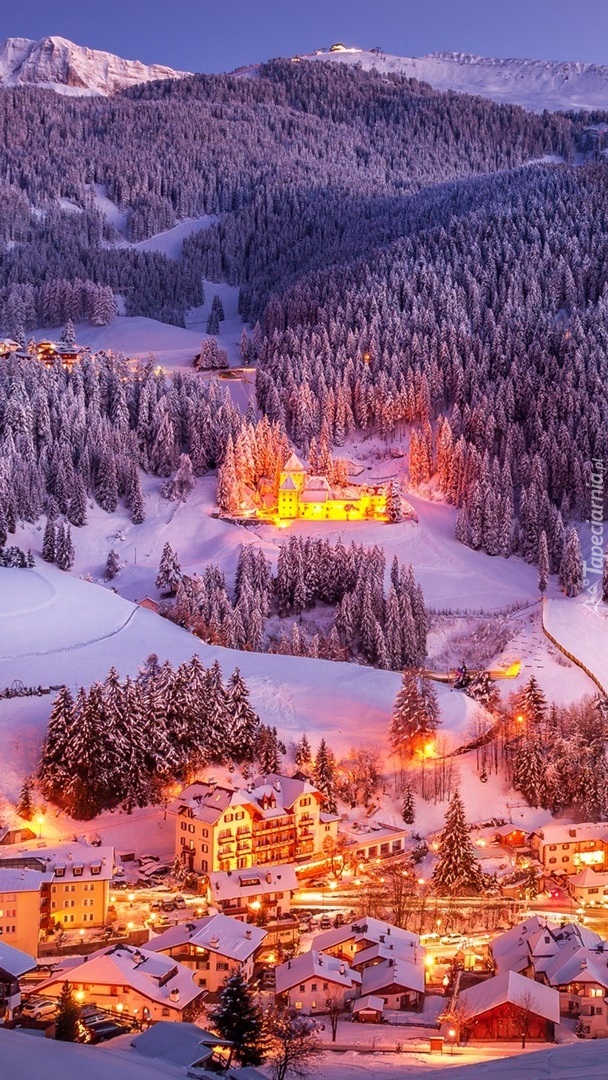 Edytor tapety: Oświetlone domy w zimowej górskiej dolinie