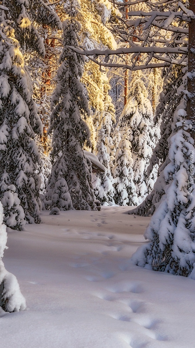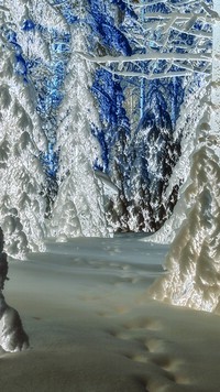 Edytor tapety: Ślady na śniegu pod drzewami