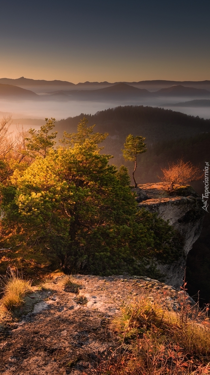 Edytor tapety: Rozświetlone jesienne drzewa na skale