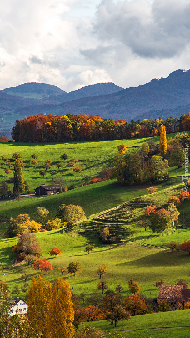 Edytor tapety: Kolorowe drzewa i domy w dolinie