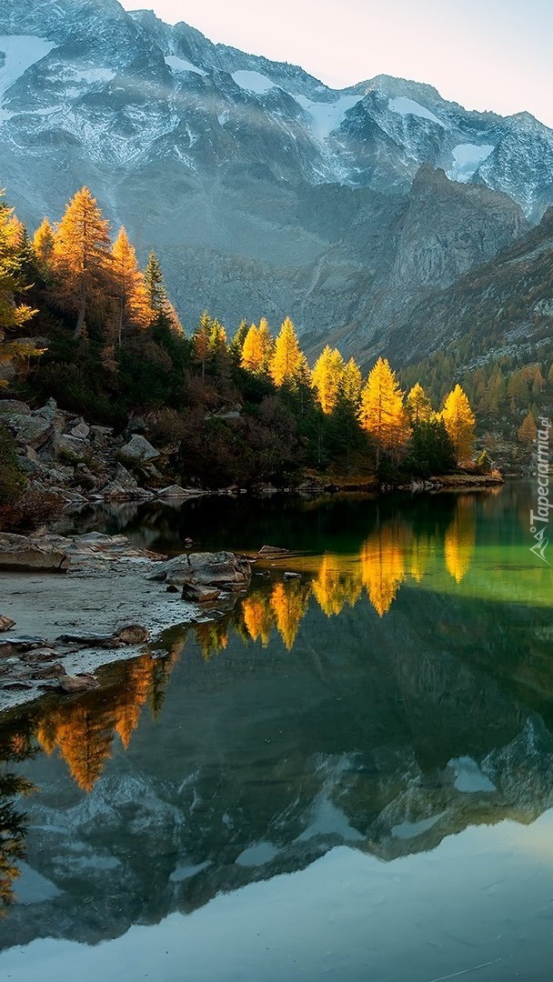 Edytor tapety: Rozświetlone drzewa nad jeziorem