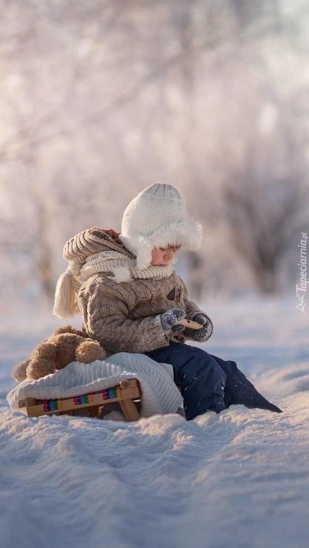 Edytor tapety: Dziecko na sankach w śniegu