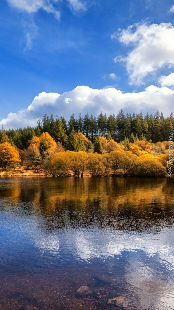 Edytor tapety: Pożółkłe drzewa nad brzegiem jeziora