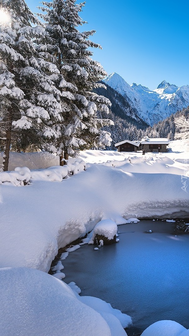 Edytor tapety: Ośnieżone drzewa na tle gór