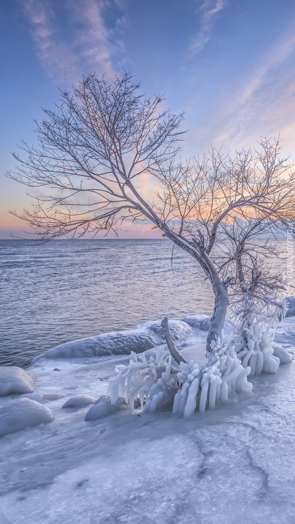 Edytor tapety: Drzewo na oblodzonym brzegu morza