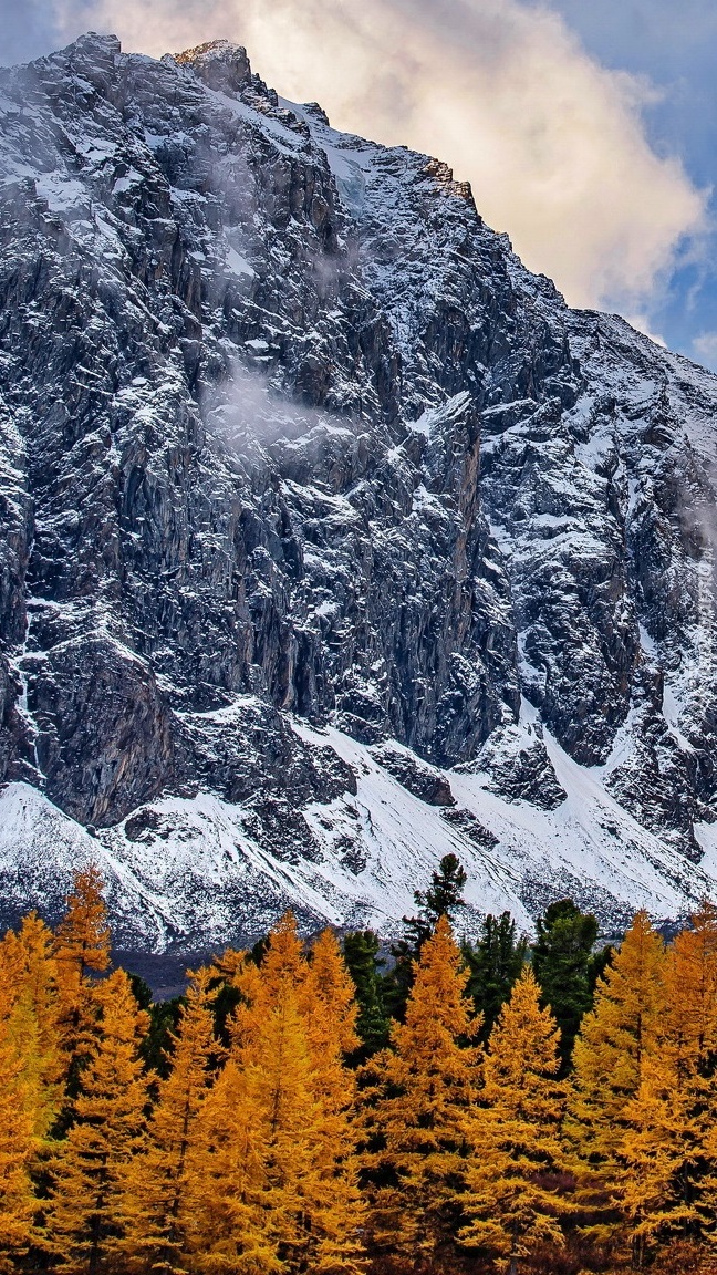 Edytor tapety: Pożółkłe drzewa na tle góry