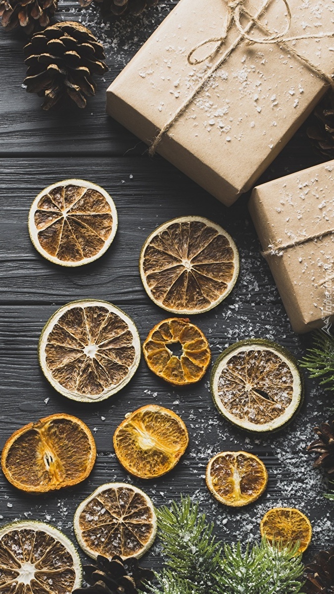 Edytor tapety: Plasterki pomarańczy obok prezentów