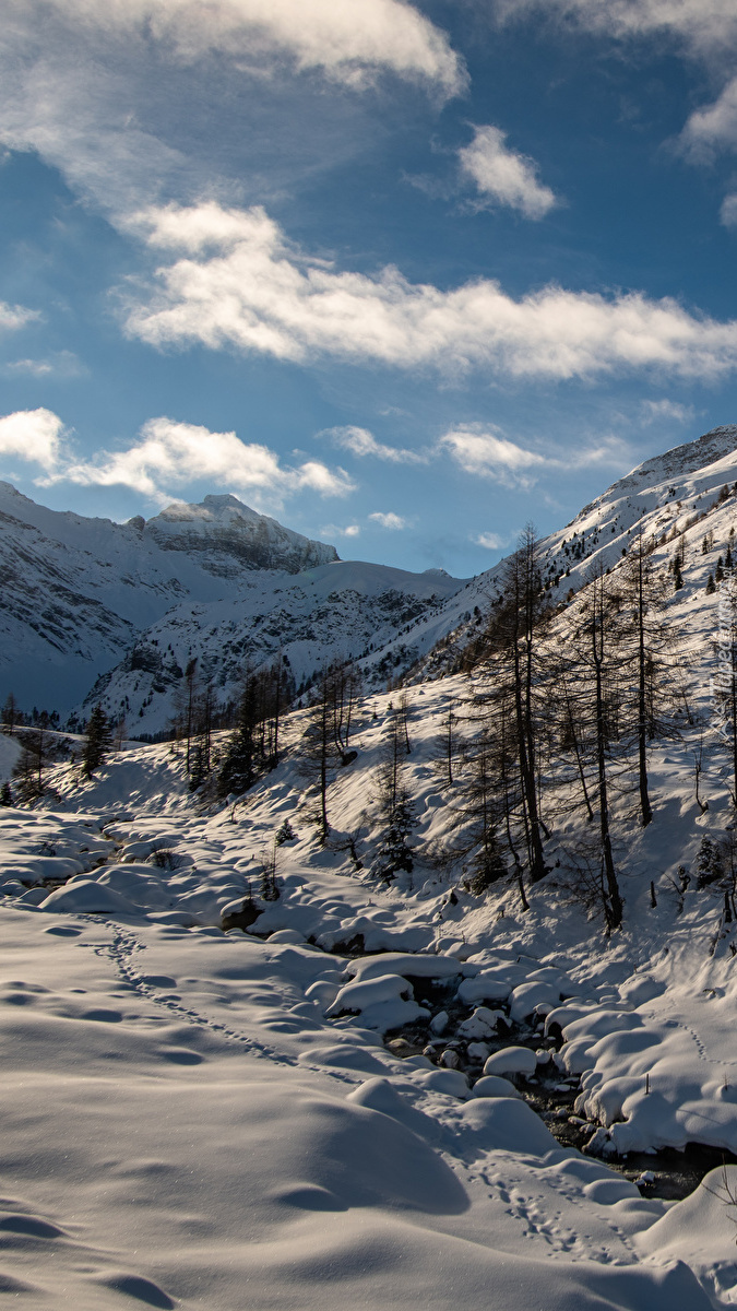 Edytor tapety: Drzewa przy zaśnieżonym strumieniu