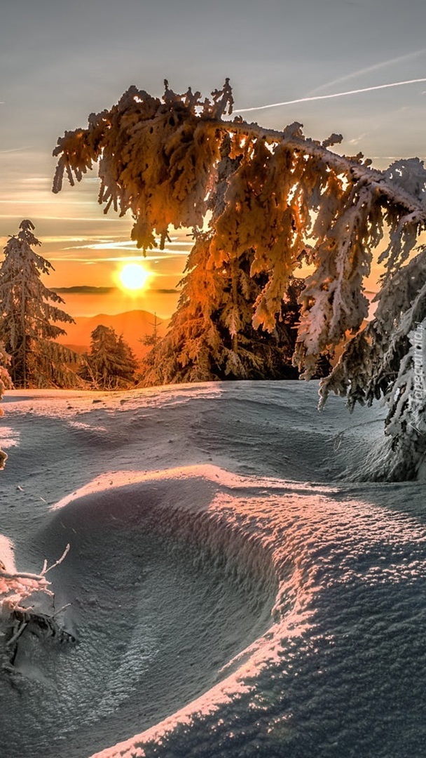 Edytor tapety: Ośnieżone drzewa w zaspach o poranku