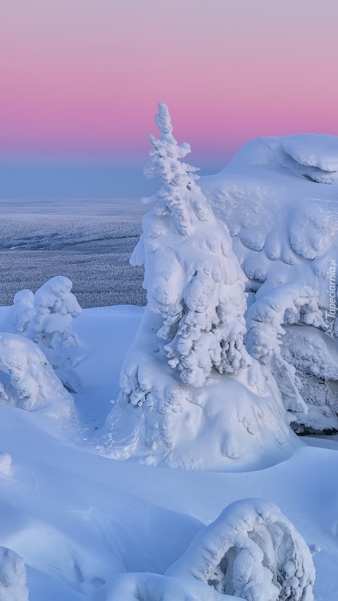 Edytor tapety: Ośnieżone drzewo przy skale