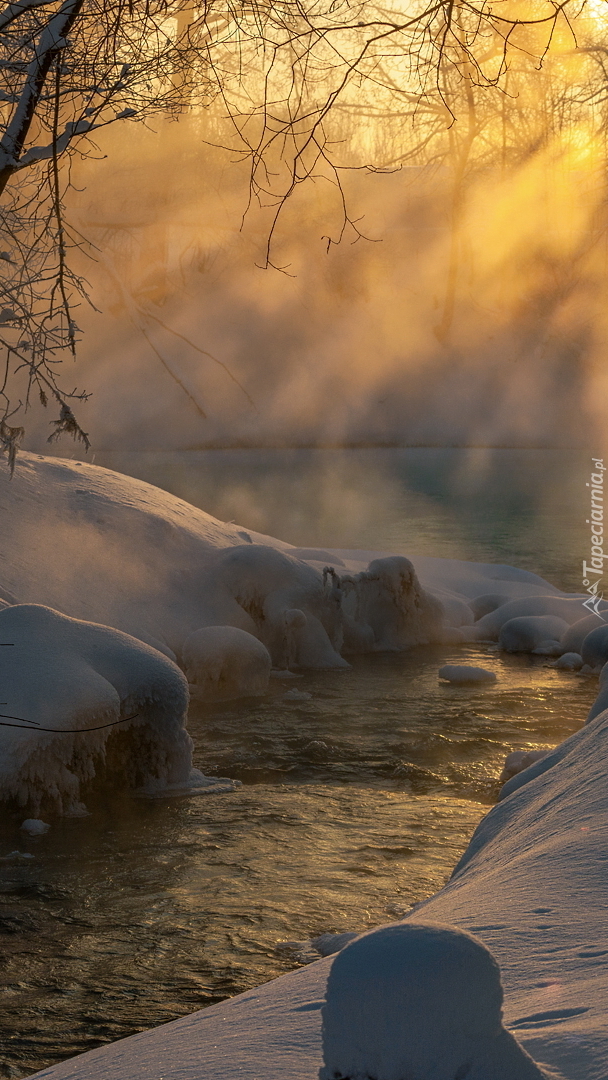 Edytor tapety: Ośnieżone brzegi zamglonej rzeki