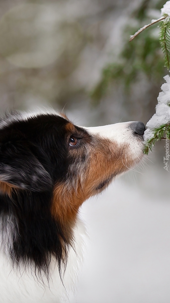 Edytor tapety: Owczarek australijski przy ośnieżonej gałązce