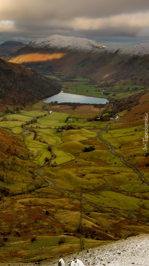 Edytor tapety: Pola i jezioro w dolinie