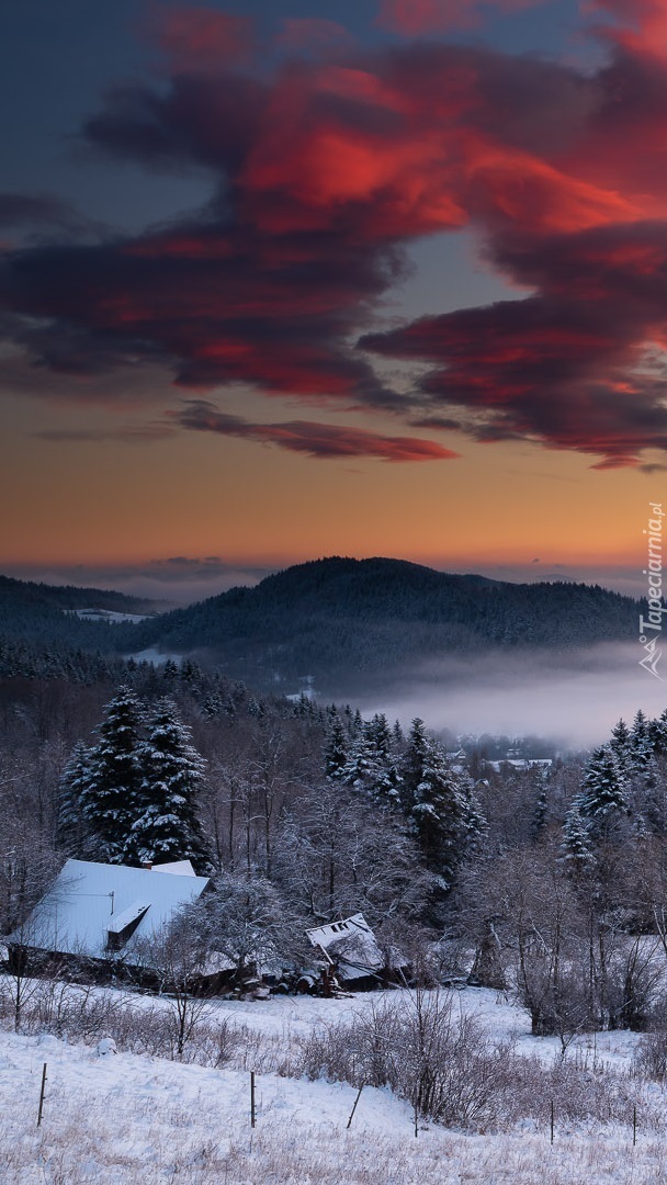Edytor tapety: Ośnieżone domy pod lasem w Zawoi
