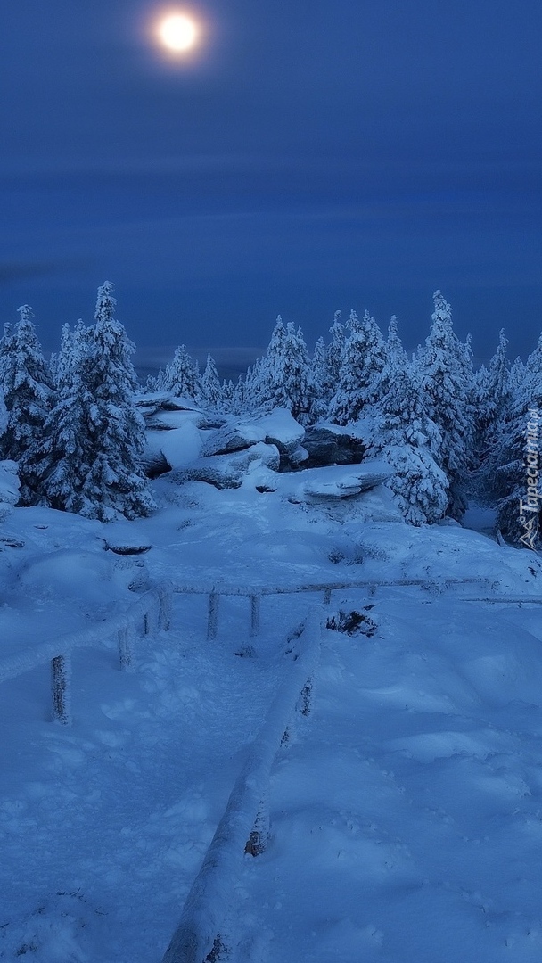 Edytor tapety: Księżycowa noc nad ośnieżonymi drzewami