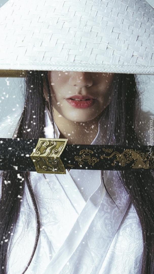 Edytor tapety: Azjatka w kapeluszu z mieczem