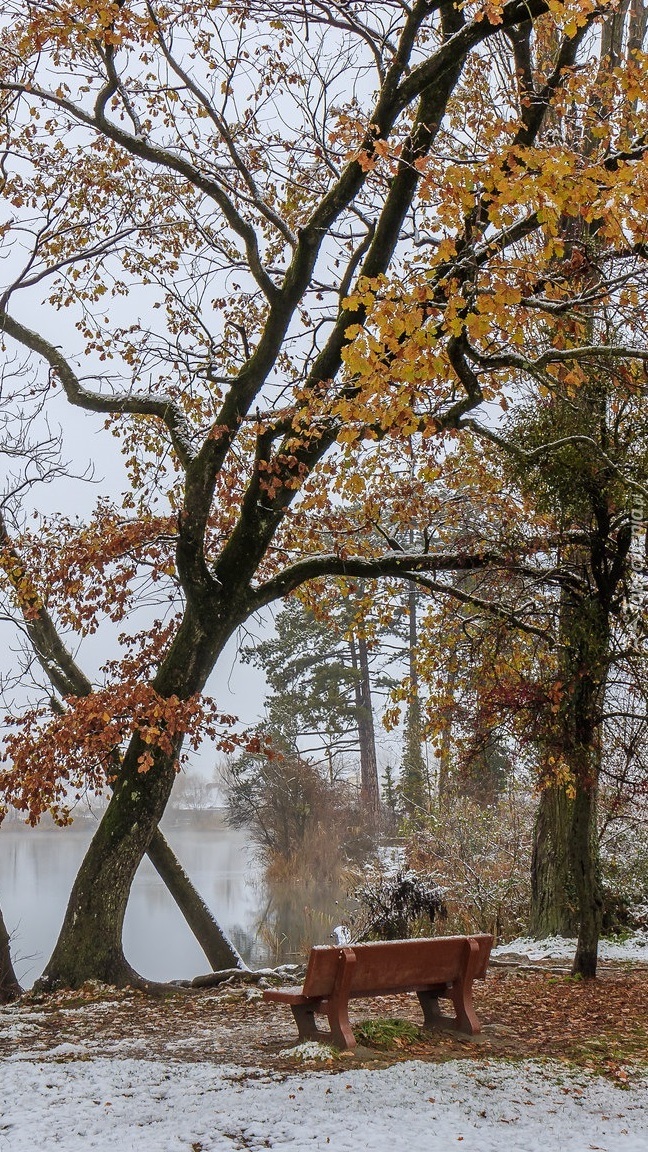 Edytor tapety: Ławka pod drzewami nad stawem