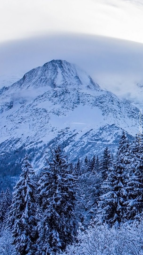 Edytor tapety: Ośnieżone góry i drzewa