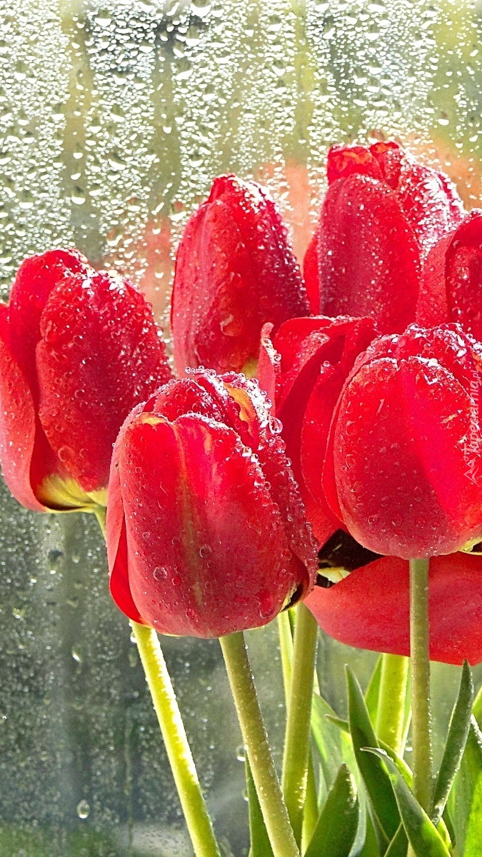Edytor tapety: Czerwone tulipany za szybą w deszczu