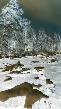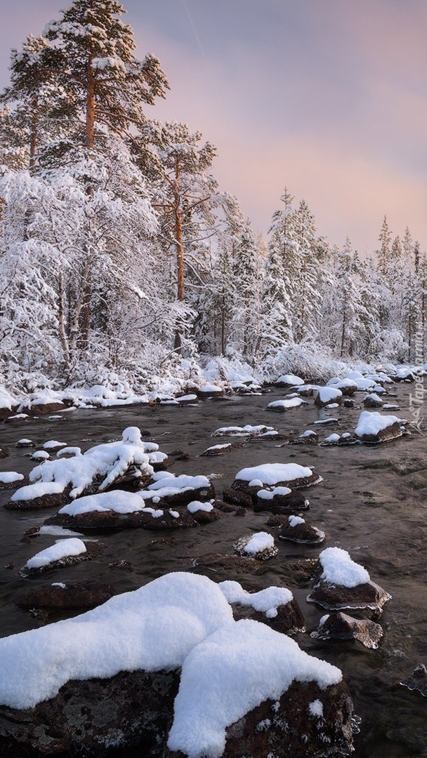 Edytor tapety: Ośnieżone drzewa i kamienie nad rzeką