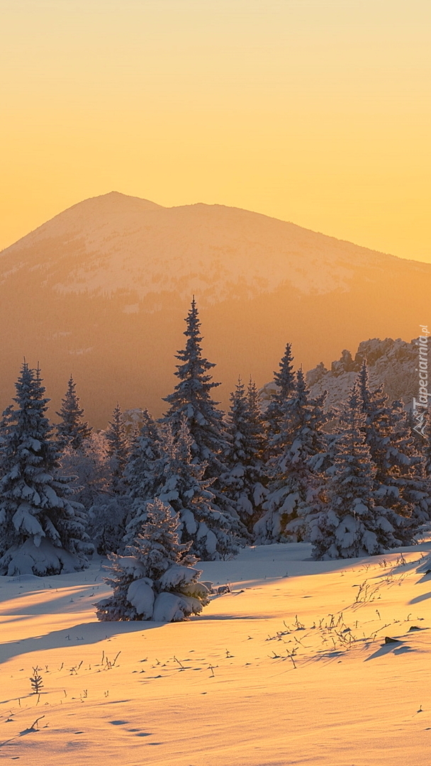 Edytor tapety: Drzewa na tle zamglonych gór