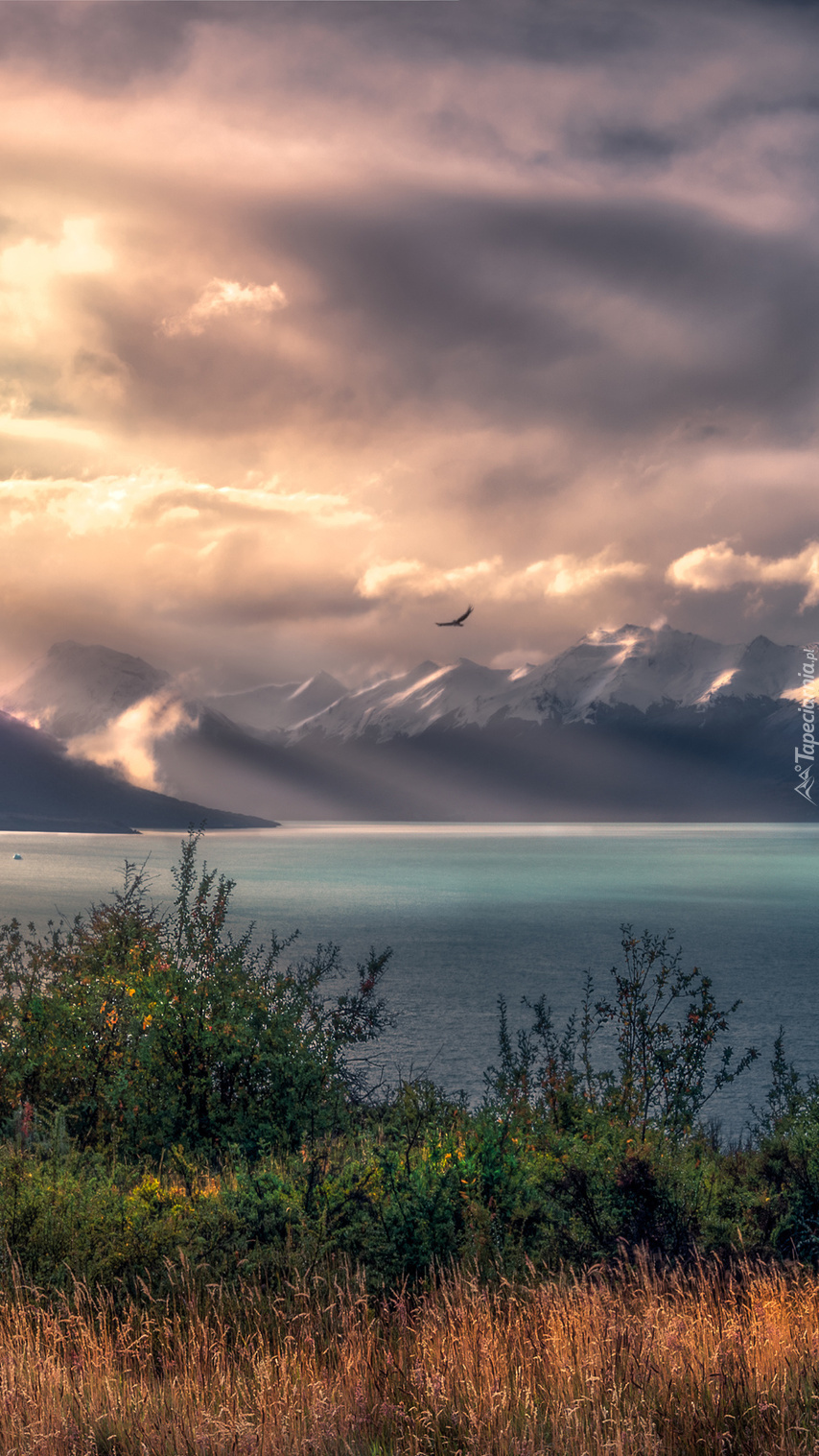 Edytor tapety: Chmury nad zamglonymi górami i jeziorem